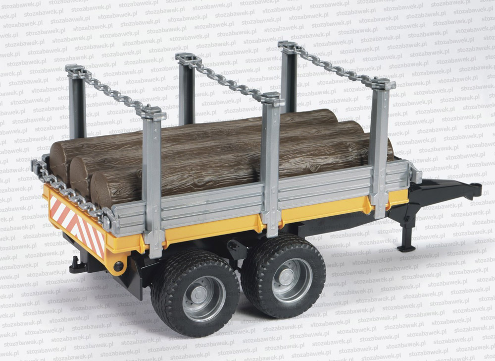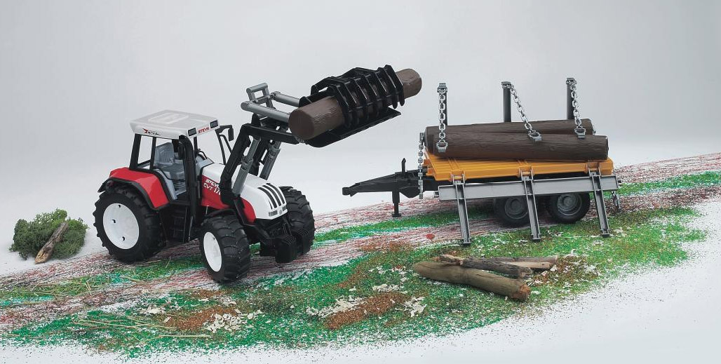 Ciągnik posiada skręcane przednie koła za pomocą dołaczonej mini kierownicy wkładanej przez zamykany otwór w dachu. Maskę od silnika można podnosić, a przednie obciążniki demontować. Pojazd wyposażony jest w demontowalną ładowarkę czołową. Na jej ramieniu można zamontować widły do podnoszenia palet (do dokupienia osobno zestaw nr 02318). Do ciągniką dołączona jest przyczepa z otwieranymi bocznymi burtami i trzema kłodami drewna. Wyposażona jest w wysuwaną nogę umożliwiającą samodzielne stanie przyczepy. Dodatkowo z przodu można dokupić lemiesz do spychania (model nr 02582 lub 02581) oraz zestaw dodatkowych pięciu drewnianych pni (model nr 02343). Ciągnik można wyposażyć także dodatkowe koła bliźniacze (model nr 02323) lub w wiele innych dołączanych akcesoriów i przyczep. Zabawka posiada miękkie gumowe opony z bieżnikiem i niezależne zawieszenie przedniej osi typu off-road.