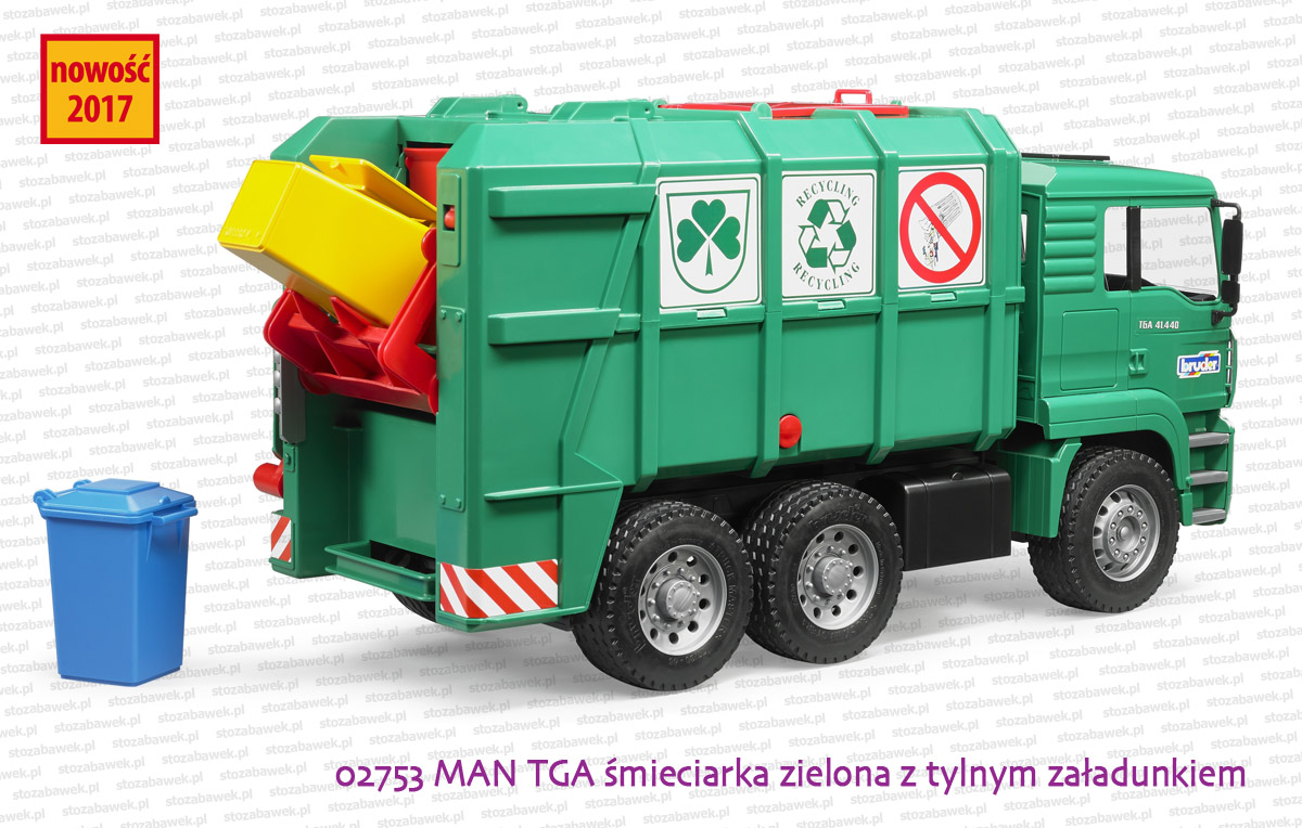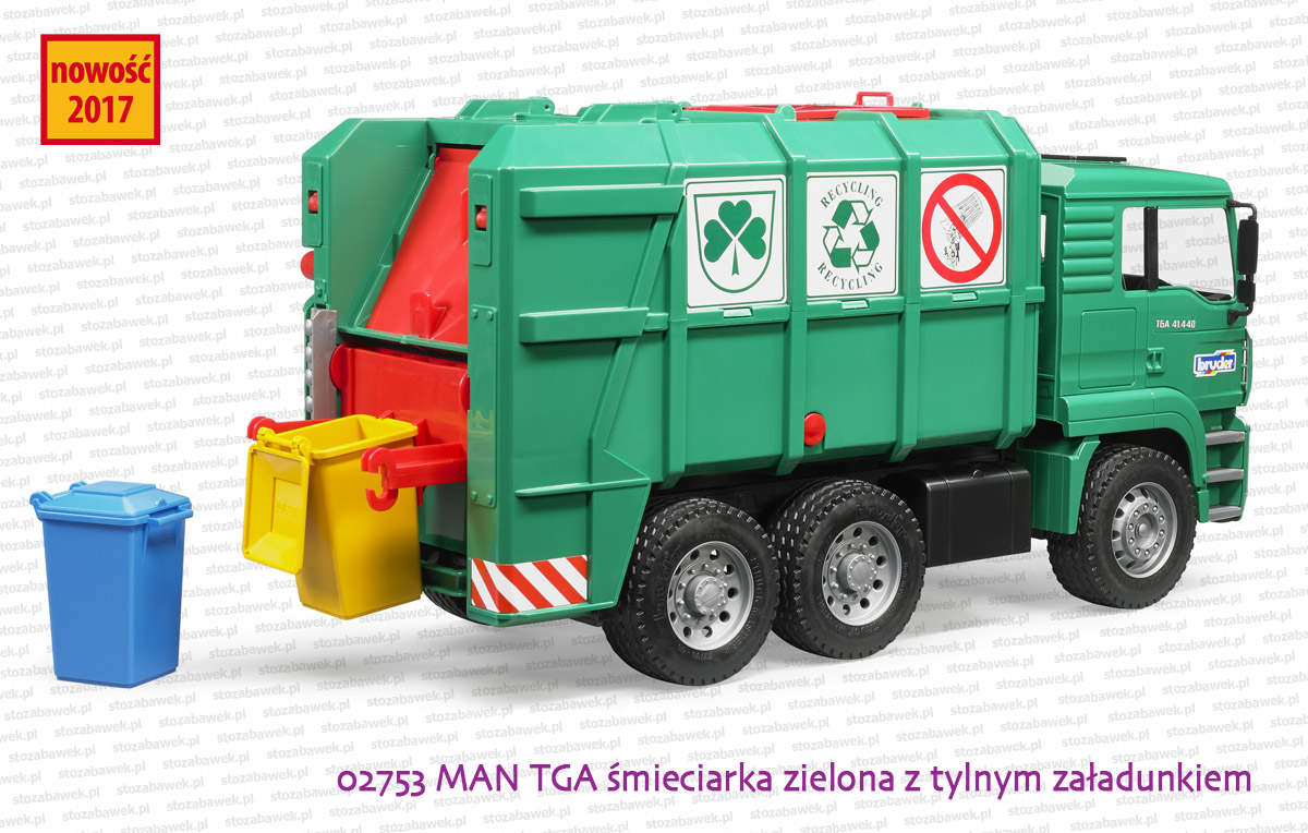 02753 BRUDER MAN TGA śmieciarka zielona z tylnym załadunkiem