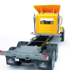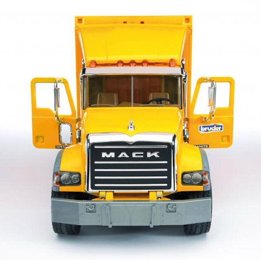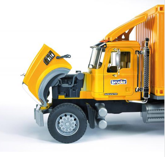 Mack posiada zdejmowany kontener, który można zestawić z ciężarówki, tak aby stał samodzielnie na wysuwanych nogach. Kontener ma sztywne boczne ściany. Tylne drzwi kontenera otwierają się. Ciężarówka ma otwierane drzwi do kabiny, składane lusterka boczne oraz otwieraną maskę silnika. Wiele elementów karoserii pomalowano imitując chromowanie, odpowiadające malowaniu prawdziwego Macka. Do zestawu dołączony jest mały widlak z wysuwanym masztem. Widlak ma trzy koła, a za pomocą pokrętła bardzo łatwo daje się sterować. Dodatkowo dołączone są dwie europalety, aby móc załadować wszystkie potrzebne rzeczy. Mack oraz widlak mają miękkie gumowe opony z bieżnikiem. Z przodu istnieje możliwość dołączenia pługu do odśnieżania (model nr 02575). Do tego zestawu pasują też inne kontenery Bruder (model nr 03900, 03910, 03920) oraz kontenery z zestawów pojazdów DHL (np 02784).