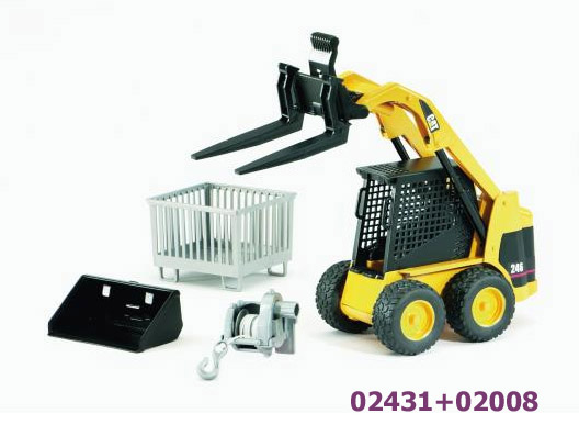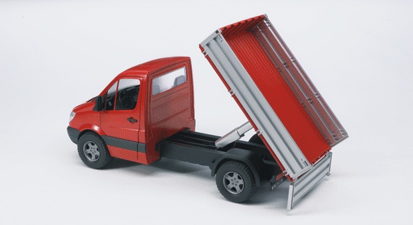Mercedes posiada otwierane drzwi boczne oraz wszystkie 3 burty. Skrzynię ładunkową można podnosić. Dodatkowo wyposażony jest w dwa najazdy umożliwiające wjazd na skrzynię np miniładowarce. W dachu ma otwieraną klapkę umożliwiającą zamontowanie modułu świetlno dźwiękowego (do kupienia osobno nr 02801). Ładowarka ma ruchomy wysięgnik i zdejmowaną łyżkę. Można ją zastąpić dodatkowymi akcesoriami takimi jak: świder, młot pneumatyczny, widły do podnoszenia palet. Zestaw nie zawiera wspomnianych akcesoriów, ale można je dokupić osobno. Można je znaleźć w naszym sklepie oznaczone symbolem 02318 i 02408. Z przodu Mercedesa jest zdejmowane mocowanie do wyciągarki, którą można dokupić osobno (zestaw nr 42545). Zarówno Mercedes jak i ładowarka posiadają miękkie gumowe opony z bieżnikiem. Do zestawu dołączone są pachołki i barierki.