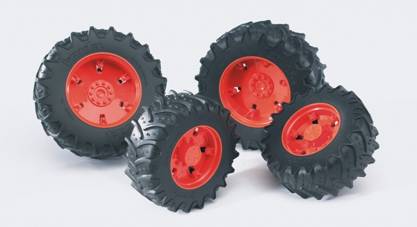 Zestaw zawiera komplet czterech kół bliźniaczych pasujących do wszystkich ciągników rolniczych serii 3000, a w szczególności do ciągników Claas modele 03010, 03011, 03012, 03013 (nie pasują do Claasa Xeriona 03015). Dwa przednie koła mają średnicę 9.8 cm, a dwa tylne 12.5 cm. Wyposażone są w mechanizm blokujący po założeniu. Bardzo łatwe w montażu. Opony są gumowe z bieżnikiem. Kolor felgi - pomarańczowy.