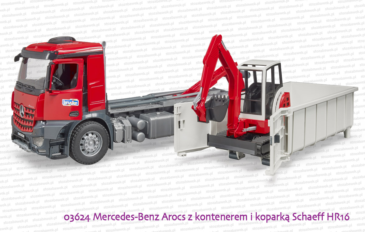 03624 BRUDER Mercedes-Benz Arocs z zsuwanym kontenerem i koparką gąsienicową Schaeff HR16