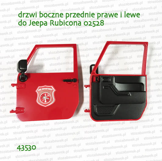 Część zamienna - drzwi boczne przednie prawe i lewe w kolorze czerwonym wraz z lusterkami do samochodów Jeep Rubicon straż pożarna (model nr 02528).